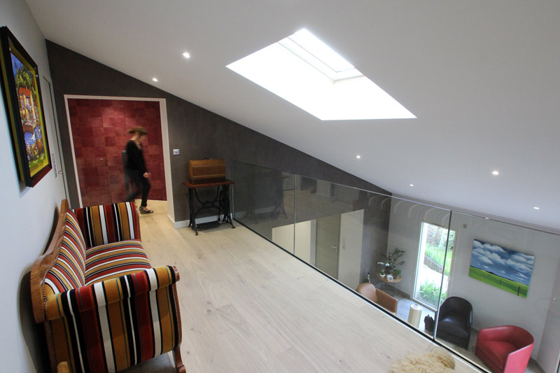Un nouveau garde-corps sur la mezzanine, tout en transparence, fait entrer la luminosité à l'étage. L'escalier fait la part belle à l'acier brut et au verre, et invite à monter à l'étage. De grandes dalles façon pierre apportent noblesse et lumière.